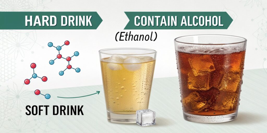 The primary difference between hard drinks and soft drinks is the presence of alcohol. Hard drinks contain alcohol (ethanol), while soft drinks do not.